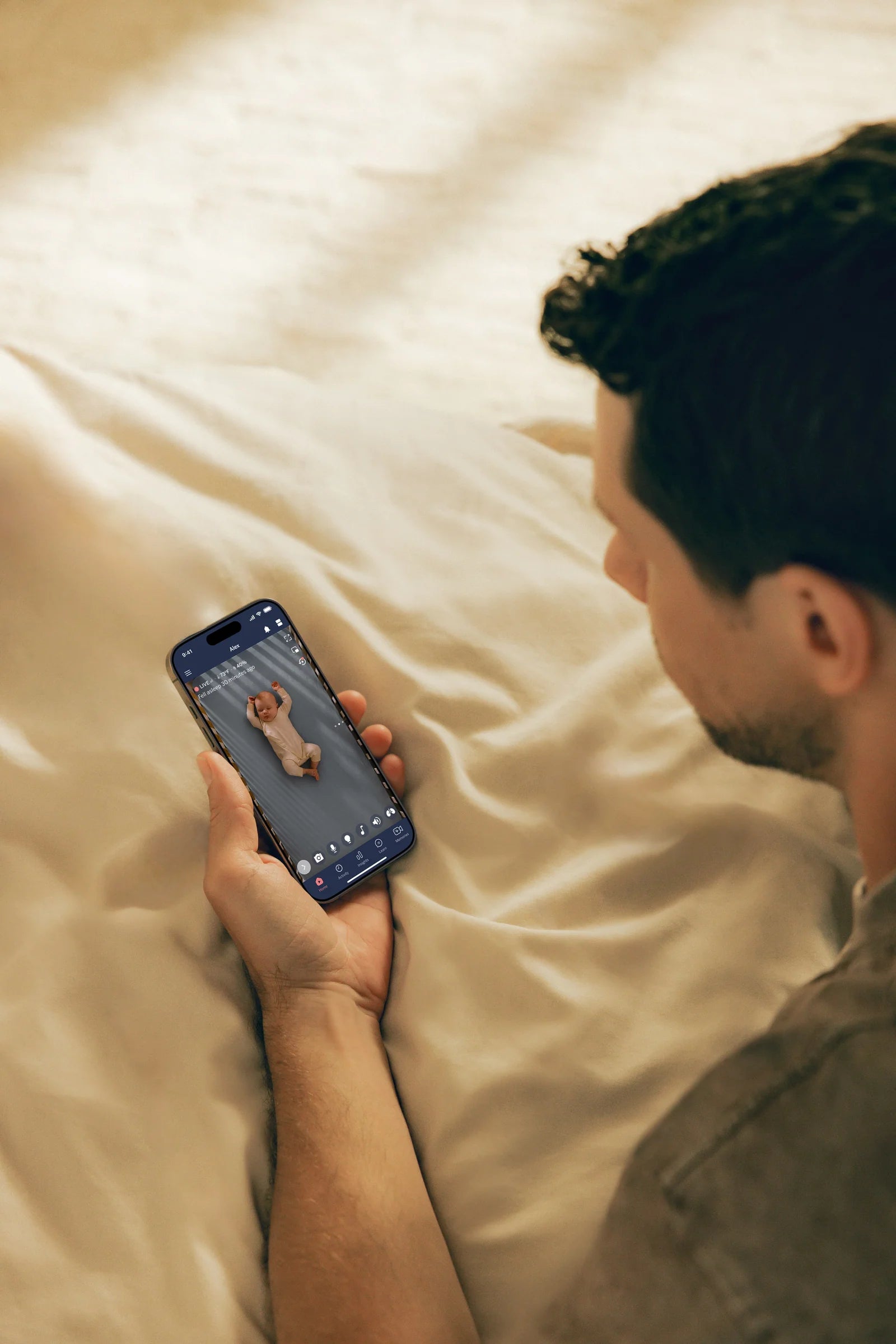 Use the Nanit app on iOS or Android to stream live video, receive real-time sound and motion alerts, view multiple cameras at once, and manage settings remotely.