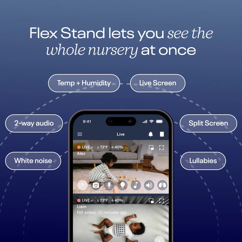 The included Flex Stand allows you to position the Nanit monitor anywhere and automatically switches to a 130-degree wide-angle view for sleep spaces, play areas or travel use.